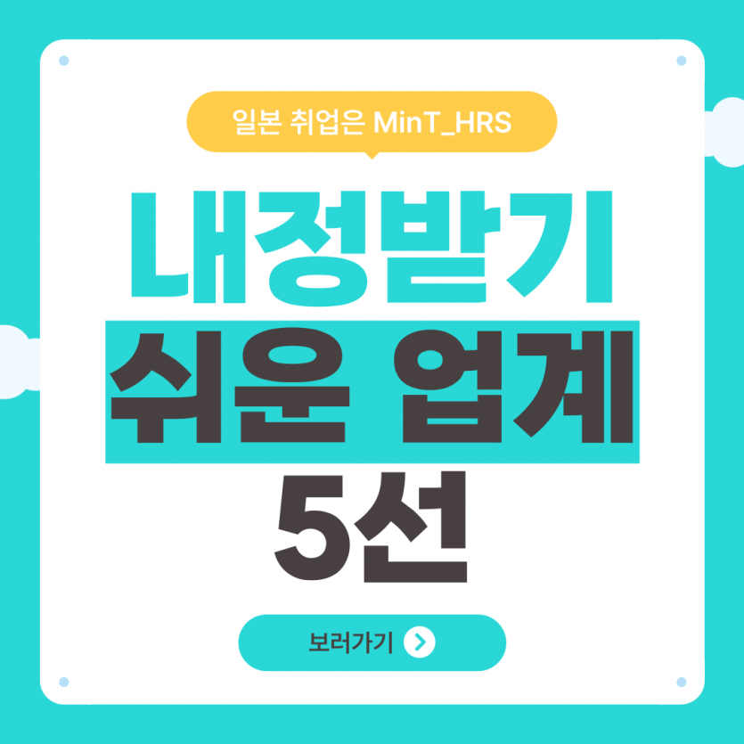 오늘은 다양한 업계 중에서도 내정이 쉬운 업계 5선을 준비했습니다! 아직 정확한 희망 업계가 정해지지 않은 분들이나, 어떤 업계라도 취업이 쉽다면 지원해보고 싶은 분들이라면 한 번 살펴보세요!