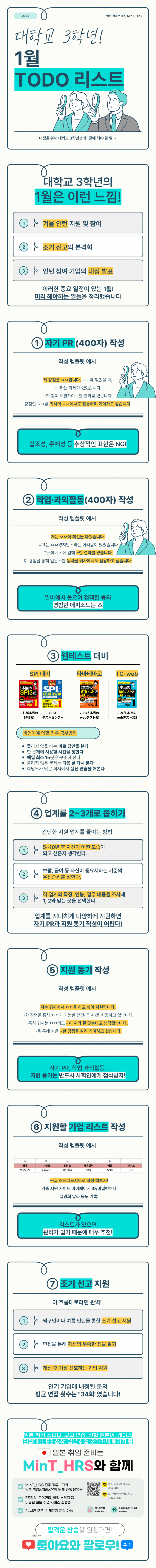 이제 1월이 얼마 남지 않았습니다! 3월부터는 ES, 웹테스트, 면접 등으로 상당히 바쁜 일정이 이어진답니다. 3월에 뒤처지지 않으려면 1월이 승부처! 오늘은 대학교 3학년이 해야할 TODO 리스트를 준비했습니다. 살펴보고 아직 준비되지 않은 부분은 없는지 체크합시다!