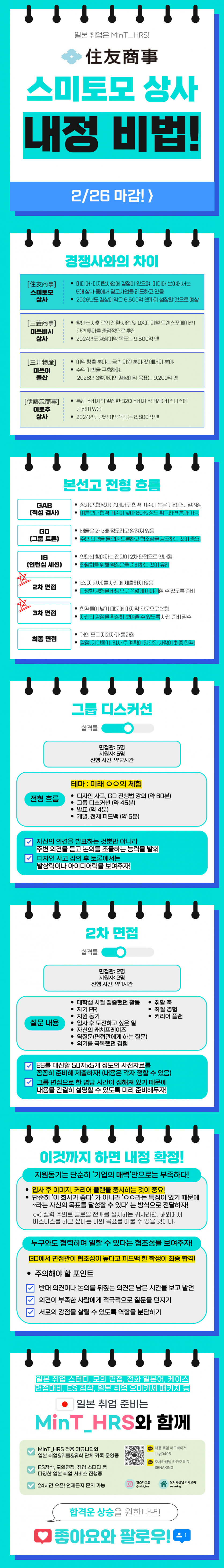 오늘은 일본 상사업계 대기업, 스미토모 상사의 전형 흐름과 비법을 알아보았습니다. 2월 26일에 마감한다고 하니 살펴보고 지원할 수 있다면 지원해봅시다!