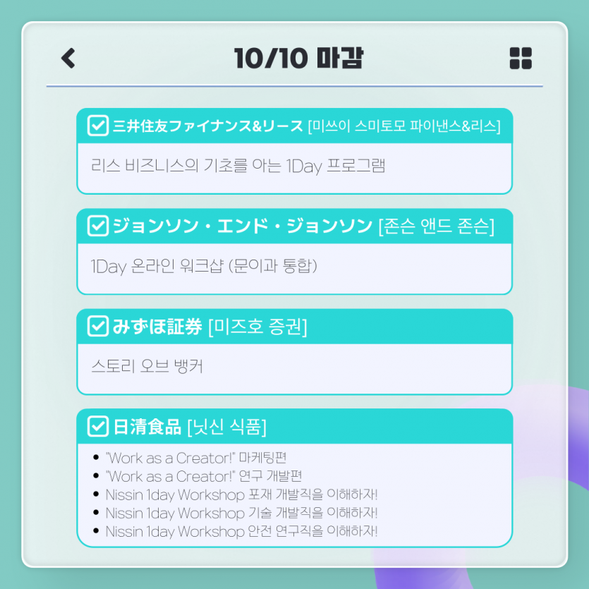 10/6~10 내정과 직결되는 인턴 조기전형 마감 기업 작성자 정보 우니쪽지보내기 메일보내기 자기소개 아이디로 검색 전체게시물쪽지보내기 메일보내기 자기소개 아이디로 검색 전체게시물 작성 작성일 2024.10.06 19:14 컨텐츠 정보 11,241 조회 0 추천 목록 답글 본문 미리 확인하고 지원하자! [이 게시물은 알라딘님에 의해 2025-03-22 21:50:52 일본 취업에서 이동 됨] 0 추천 관련자료 이전 26졸 취준생 10월 TODO 리스트! 작성일 2024.10.07 22:36 다음 10/5~10/13 인턴 마감 기업 48선! 작성일 2024.10.05 12:41 댓글 0 등록된 댓글이 없습니다. Select File Upload File 목록 답글