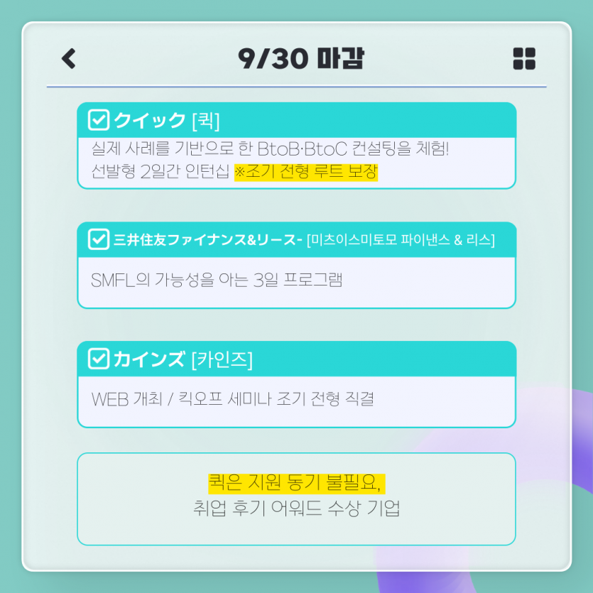 09/26~30 인턴 조기전형 마감순 정리 작성자 정보 우니쪽지보내기 메일보내기 자기소개 아이디로 검색 전체게시물쪽지보내기 메일보내기 자기소개 아이디로 검색 전체게시물 작성 작성일 2024.09.25 17:44 컨텐츠 정보 11,400 조회 0 추천 목록 답글 본문 내정과 직결되는 인턴 기업 확인해보자[이 게시물은 알라딘님에 의해 2025-03-22 21:51:00 일본 취업에서 이동 됨] 0 추천 관련자료 이전 9/29~10/4 인턴 마감 우량기업 7선! 작성일 2024.09.26 16:11 다음 디벨로퍼의 실무 요약! 면접 전에 알아두자! 작성일 2024.09.24 19:34 댓글 0 등록된 댓글이 없습니다. Select File Upload File 목록 답글