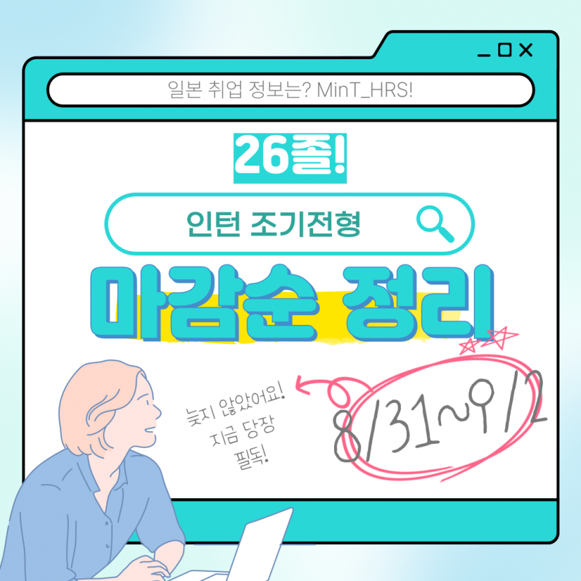 8/31~9/2 인턴 조기전형 마감순 정리! 작성자 정보 우니쪽지보내기 메일보내기 자기소개 아이디로 검색 전체게시물쪽지보내기 메일보내기 자기소개 아이디로 검색 전체게시물 작성 작성일 2024.08.29 16:13 컨텐츠 정보 12,964 조회 0 추천 목록 답글 본문 26졸은 놓치지 말고 확인해보세요![이 게시물은 알라딘님에 의해 2025-03-22 21:51:16 일본 취업에서 이동 됨] 0 추천 관련자료 이전 9월 5일~9월 11일 인턴 마감 기업을 알아보자! 작성일 2024.08.30 11:50 다음 25졸 필독! 8/31일까지 꼭 봐야하는 TODO 리스트! 작성일 2024.08.28 21:50 댓글 0 등록된 댓글이 없습니다. Select File Upload File 목록 답글